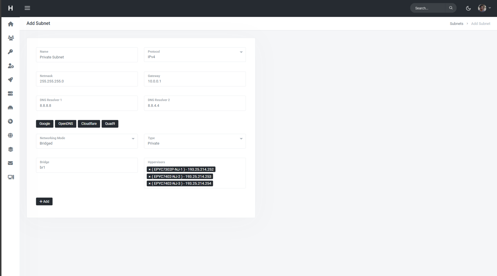 - If you have setup a VLAN for private networking among all hypervisors over secondary physical interface then you can select multiple hypervisors here for the same subnet to be used everywhere.